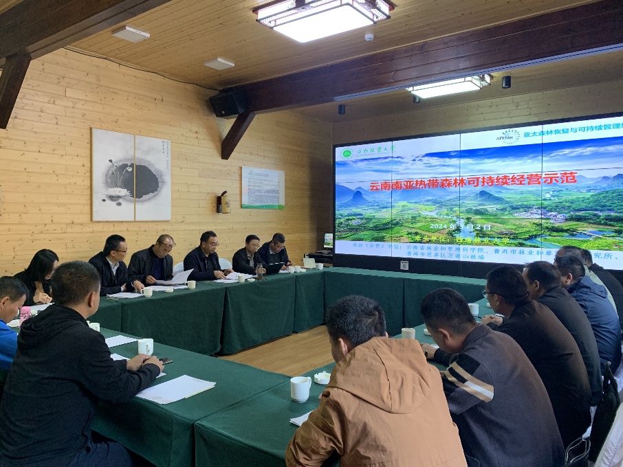 由亚太森林组织、西南林业大学共同牵头组织的“普洱森林可持续经营示范”项目磋商会于2024年3月2日在亚太森林组织普洱基地举行,亚太森林组织秘书长鲁德博士、西南林业大学校长王卫斌教授以及云南省林科院、普洱市林业和草原局、普洱市林科所、思茅区国有林场、万掌山林场等项目单位负责人和技术人员近二十余人参加了会议,会议由亚太森林组织昆明中心主任沈立新研究员主持。